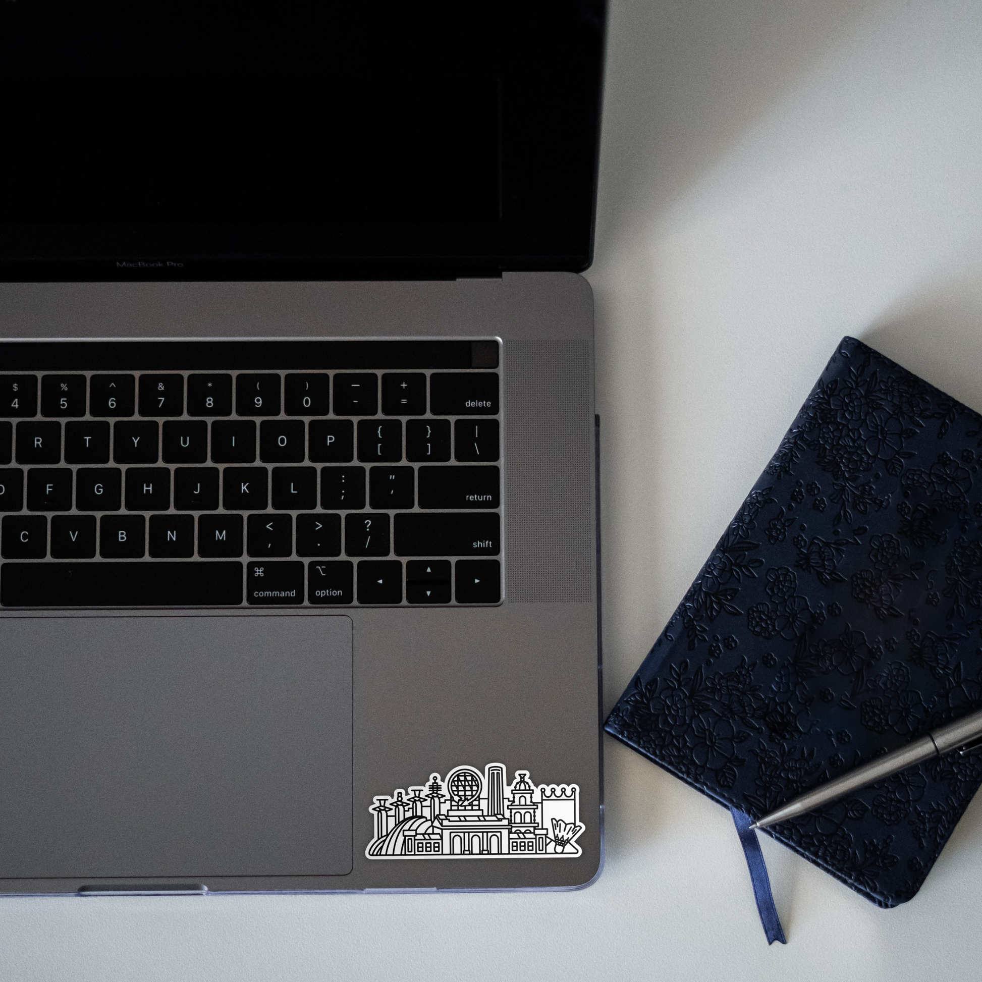 This design of the Kansas City skyline includes Union Station, the Liberty Memorial, Kauffman Center, a shuttlecock and more.